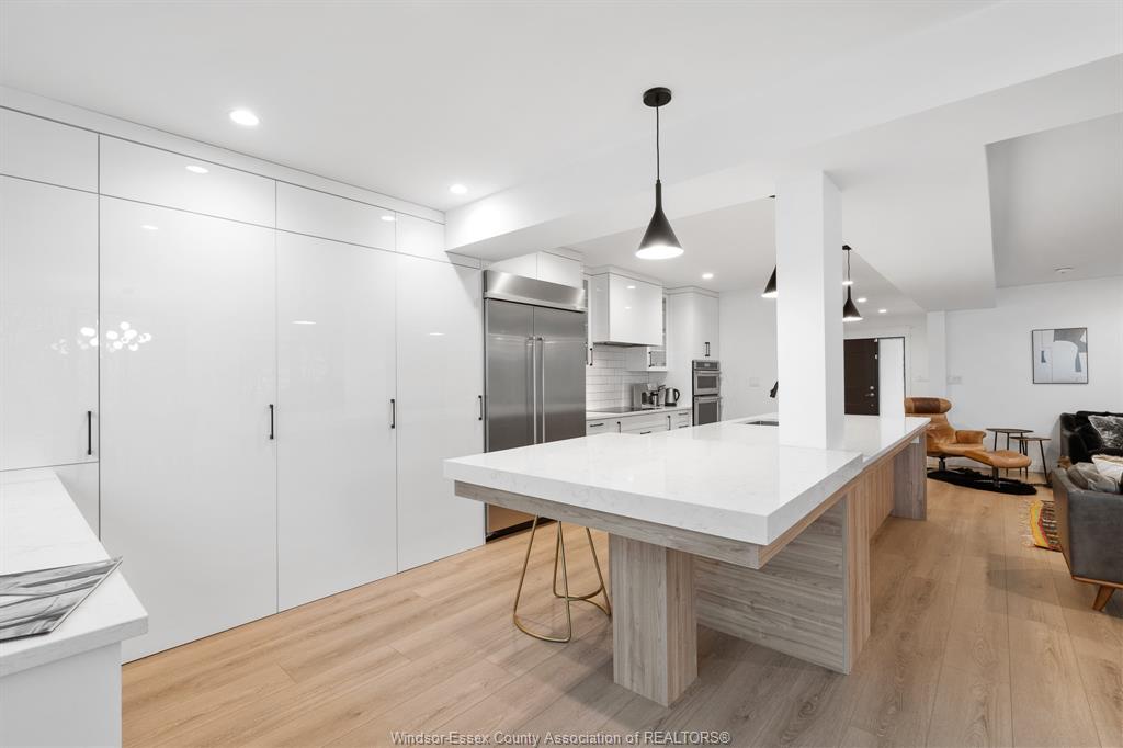 The chef’s kitchen is a showpiece with Cambria quartz counters, hidden walk-in pantry & open