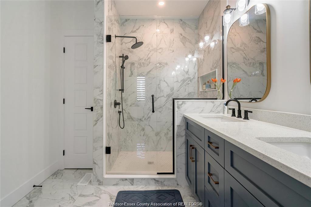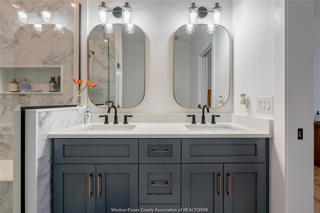 tiled shower with built-in seat and a custom double vanity for ultimate convenience.