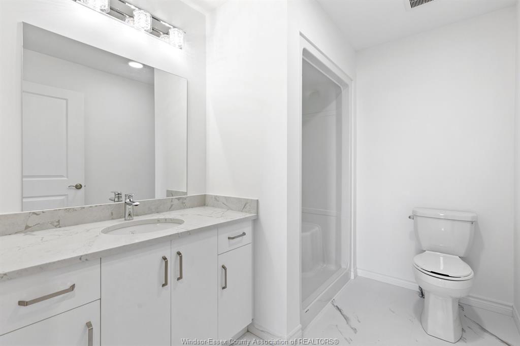 bathrooms on both levels, with open-concept layouts, quartz countertops, kitchen islands, and luxury vinyl