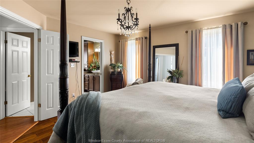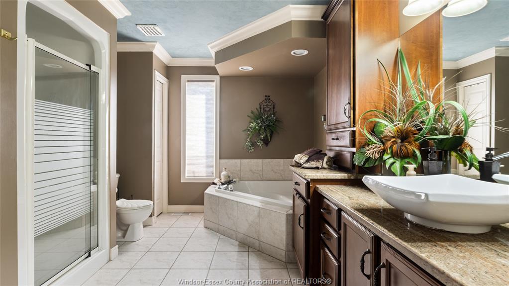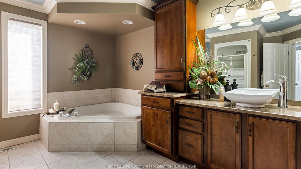 luxurious bath with jacuzzi tub, glass shower and custom vanity. Lower level has been wonderfully