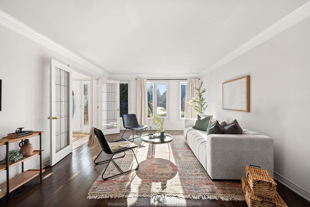 features include soaring 18 ft ceilings in the entryway, two main level living rooms, primary ensuite