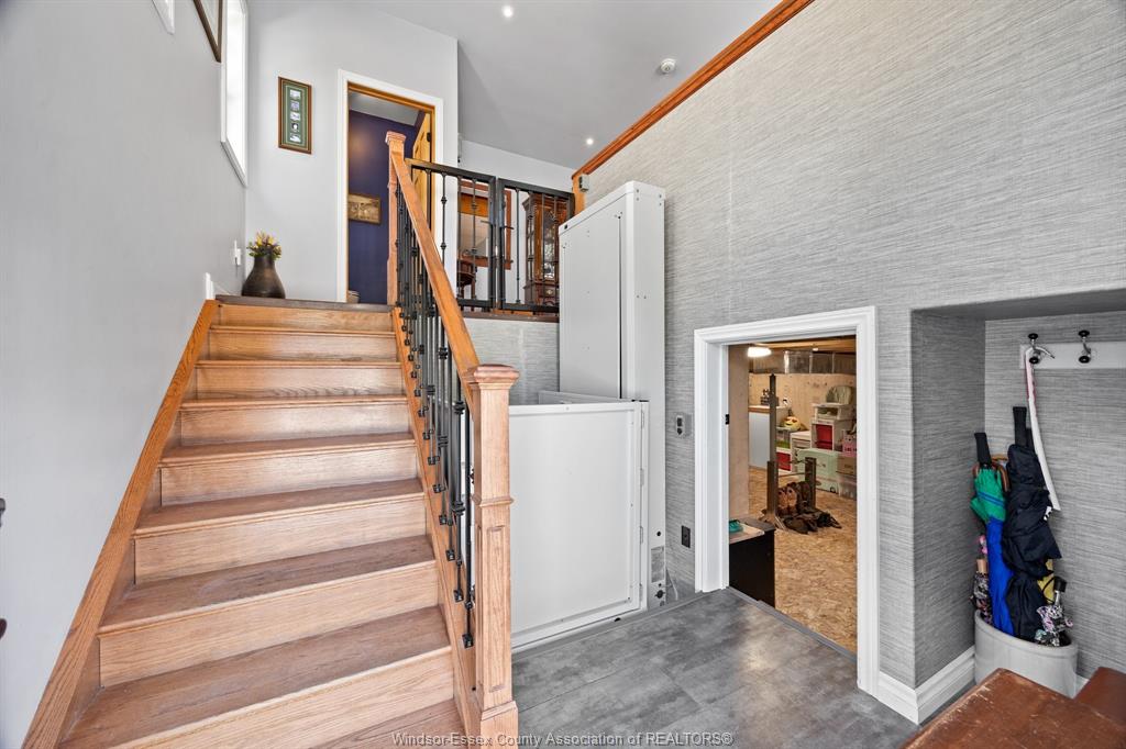 room with clevator lift to rear entry door, eat in kitchen, formal dining (or 4th bedroom) 2 washrooms, Foyer & Laundry. Upper