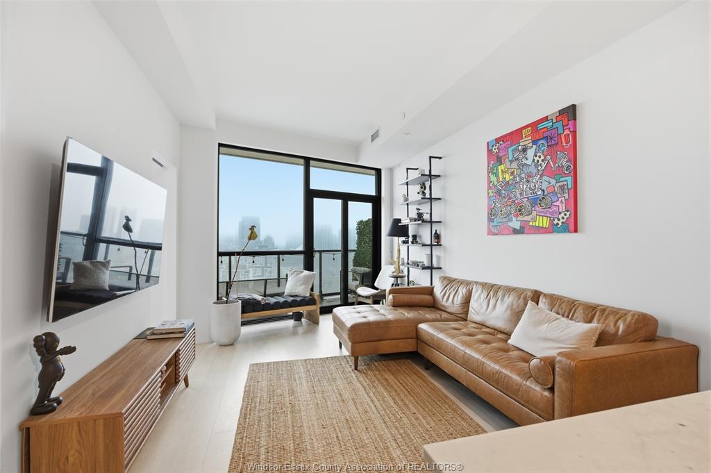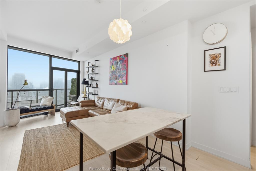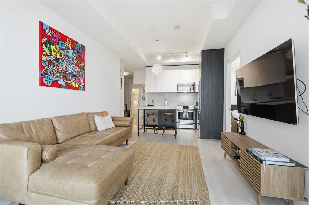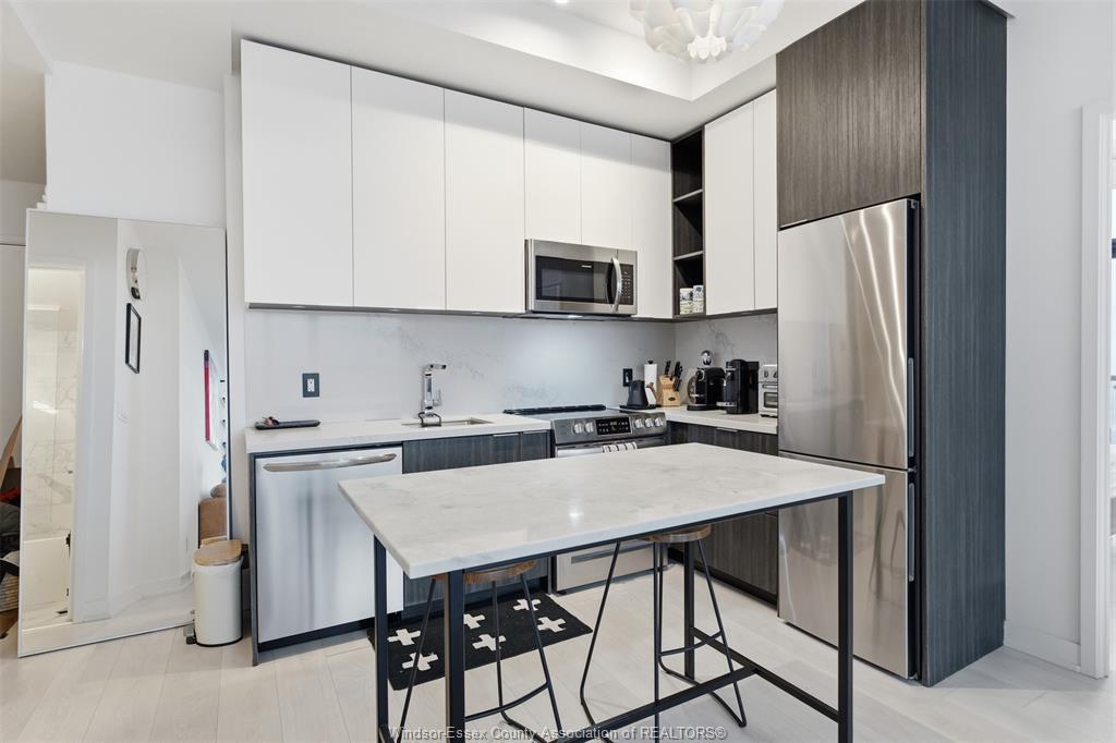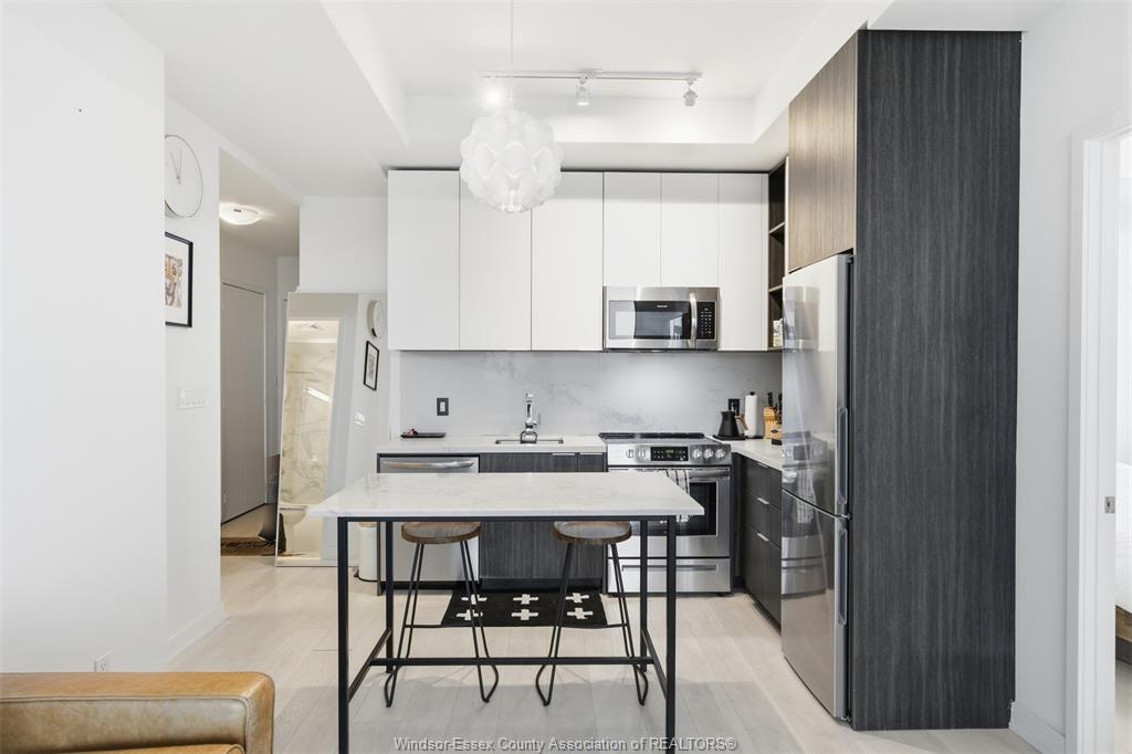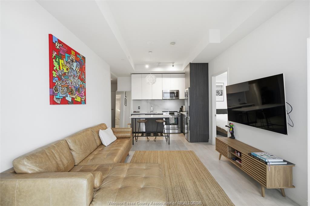Inside, the suite features a sleek open-concept layout with a contemporary kitchen, quartz countertops, stainless steel appliances, and a functional island perfect for dining and entertaining. The living space is thoughtfully designed with clean finishes, wide-plank flooring, and an abundance of natural light throughout.
