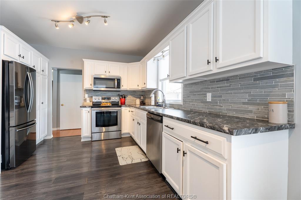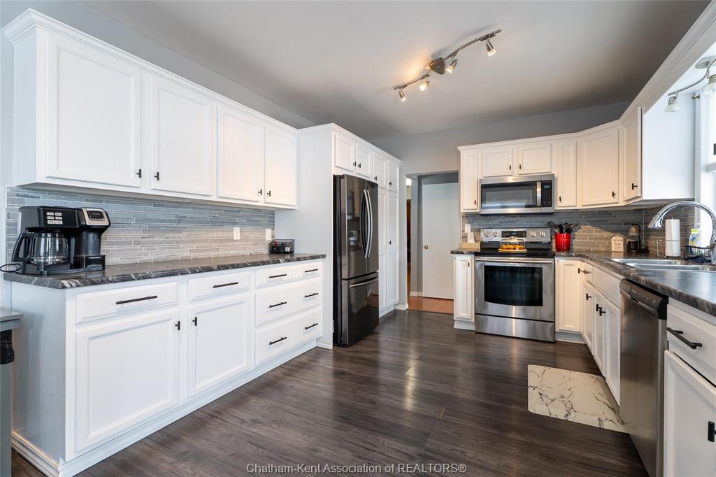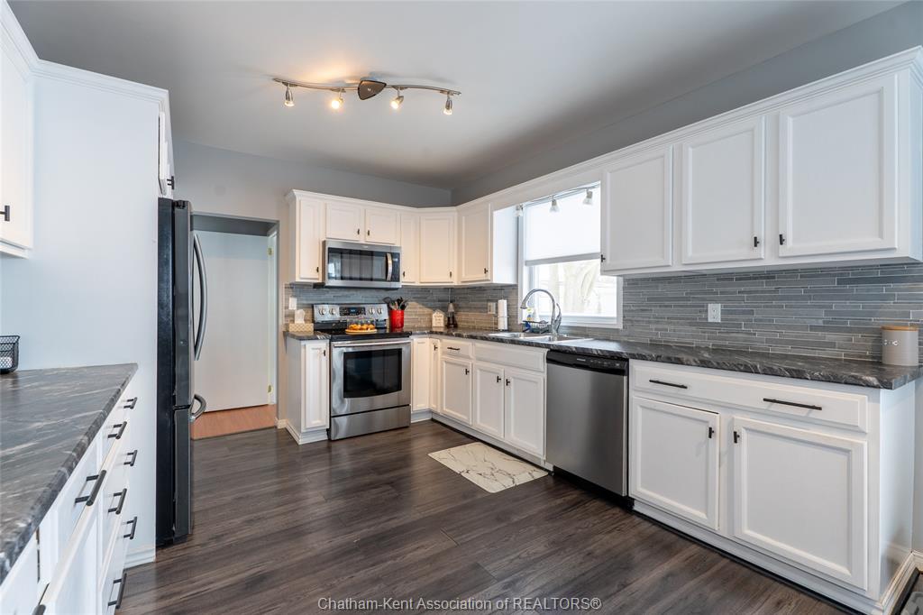 Fridge, stove, dishwasher, washer, dryer, microwave rangehood combo, all window coverings, light fixtures, bathroom mirrors. (All appliances are "as is") Driveway