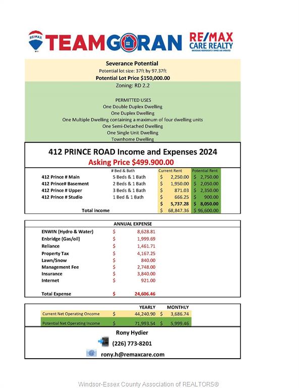 THIS INCOME-GENERATING PROPERTY FEATURES FOUR SELF-CONTAINED UNITS: A SPACIOUS 5-BEDROOM MAIN FLOOR, 3-BEDROOM SECOND FLOOR, 2-BEDROOM BASEMENT UNIT, AND A 1-BEDROOM ATTIC SUITE — EACH EQUIPPED WITH A FULL KITCHEN AND BATHROOM. WITH A TOTAL POTENTIAL RENT OF UP TO $8,050/MONTH ($96,600/YEAR) AND A PROJECTED NOI OVER $71,000, ADDITIONAL HIGHLIGHTS INCLUDE 200 AMP SERVICE WITH SUB-PANELS, REAR PARKING FOR 4 VEHICLES, AND SEPARATE ENTRANCES FOR EACH UNIT.THE PROPERTY SUPPORTS FUTURE DEVELOPMENT OPTIONS INCLUDING TOWNHOMES, DUPLEXES, OR A 4-UNIT MULTIPLEX. LOCATED NEAR THE UNIVERSITY OF WINDSOR, HISTORIC SANDWICH TOWN, AND JUST MINUTES TO THE NEW GORDIE HOWE INTERNATIONAL BRIDGE, THIS HIGH-DEMAND AREA OFFERS LONG-TERM VALUE AND RENTAL STABILITY. THE SELLER RESERVES THE RIGHT TO ACCEPT, DECLINE, OR COUNTER ANY OFFER AT THEIR SOLE DISCRETION. SCHEDULE B FOUND IN DOCUMENTS. BUYER TO VERIFY ALL INFORMATION, INCLUDING ZONING, SEVERANCE POTENTIAL, AND DEVELOPMENT OPTIONS DIRECTLY WITH THE MUNICIPALITY.