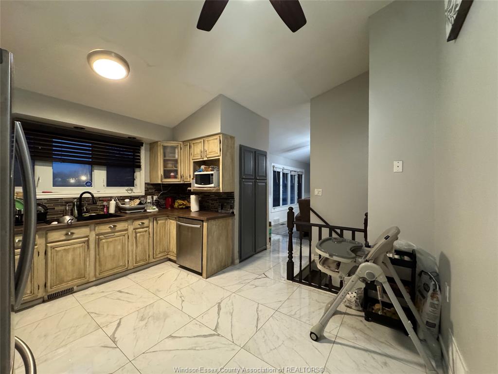level offers open concept living & dining room with updated large kitchen with stainless steel