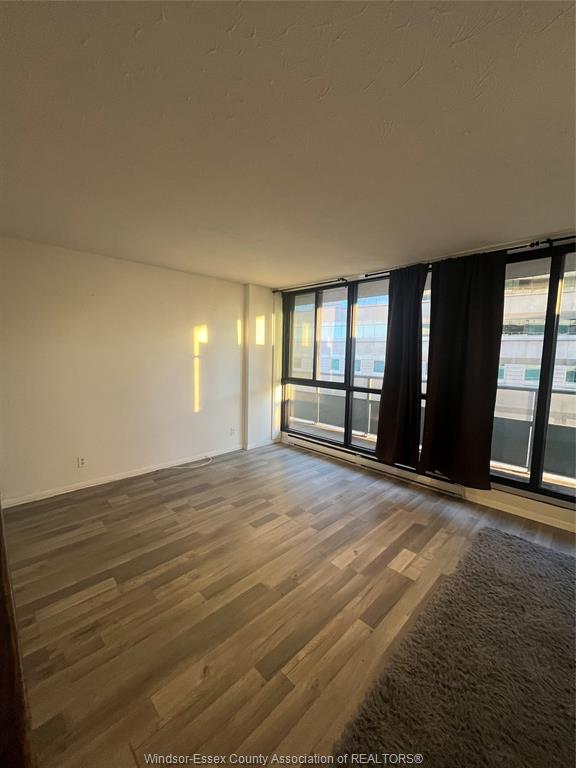One Bedroom condo with a large balcony, located at 111 Riverside Dr E. Features, laminate flooring throughout, renovated living area,