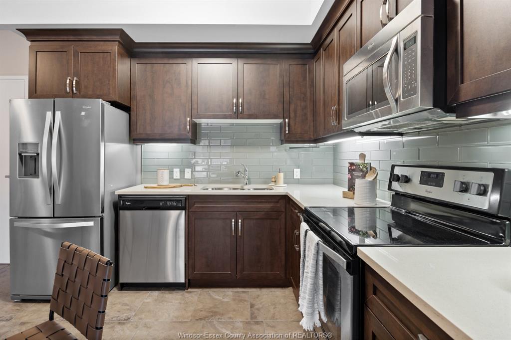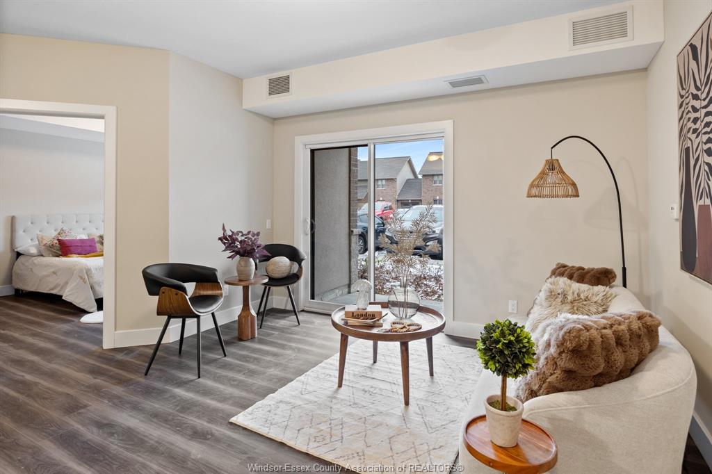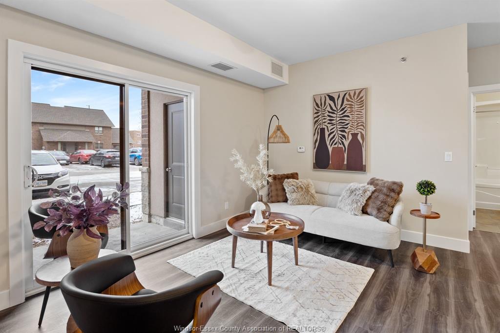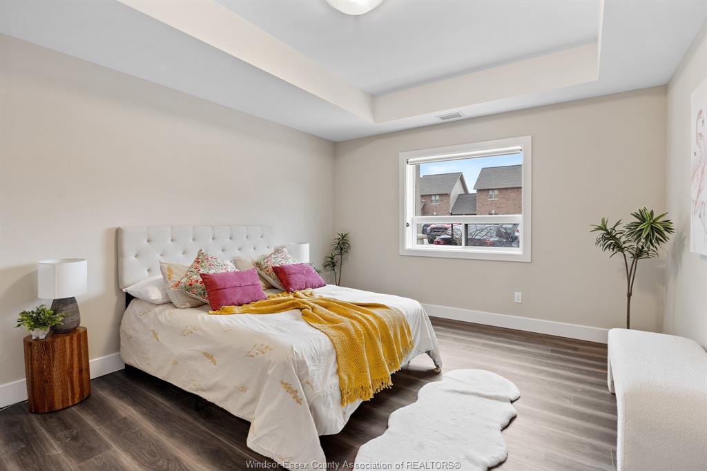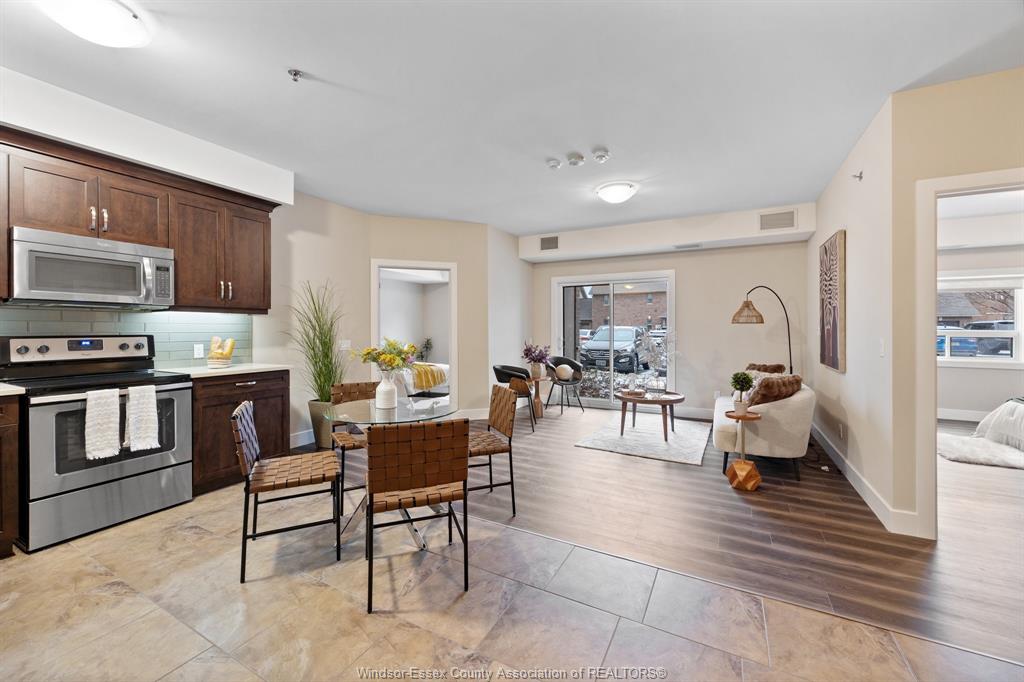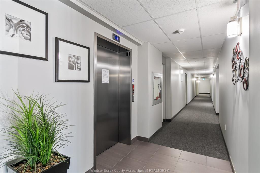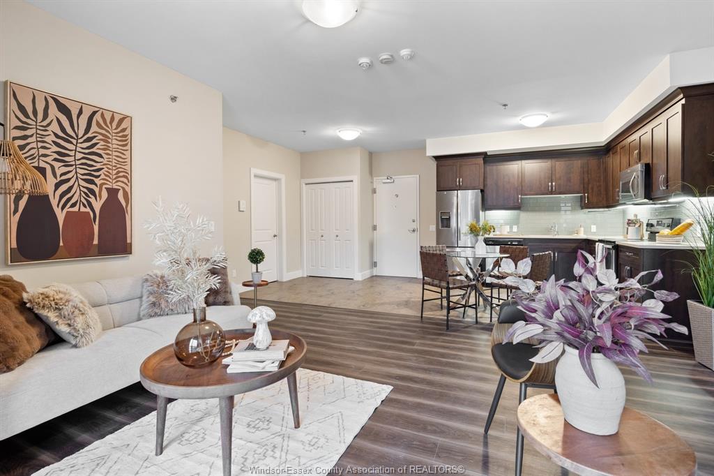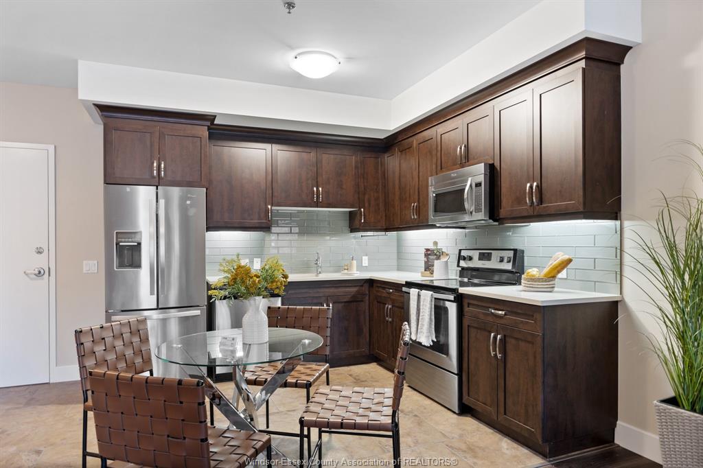 Welcome to Rivertown Terrace, a signature Valente Development Corporation community in the heart of East Windsor/Riverside. This inviting 2-bed, 2-bath condo blends comfort, style, and convenience with a bright open-concept layout, 9ft ceilings, and a spacious private balcony. The gourmet kitchen features stainless steel appliances, recessed shaker-style cabinetry, and a large breakfast peninsula perfect for everyday dining. The primary suite offers a generous closet and direct access to a well-appointed bathroom.