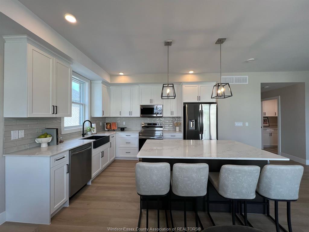 with wide plank flooring, large windows, and a contemporary kitchen featuring quartz countertops, sleek cabinetry, stainless steel appliances, and a large