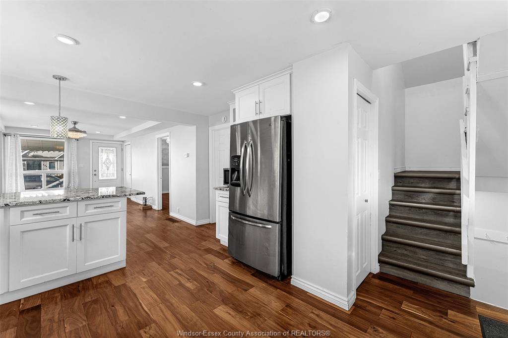 large kitchen with island seating, living room, bedroom and 4pc bathroom. Second floor has a bedroom w a seating