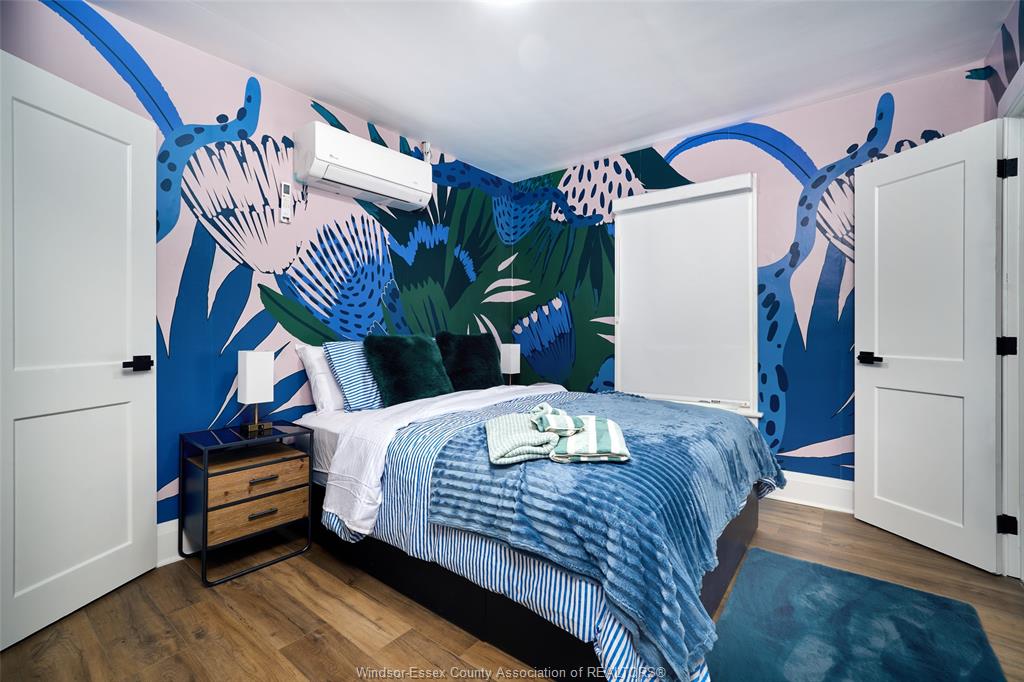 master suite with a private 2-piece ensuite bath. Central air conditioning, shared rear yard, and a
