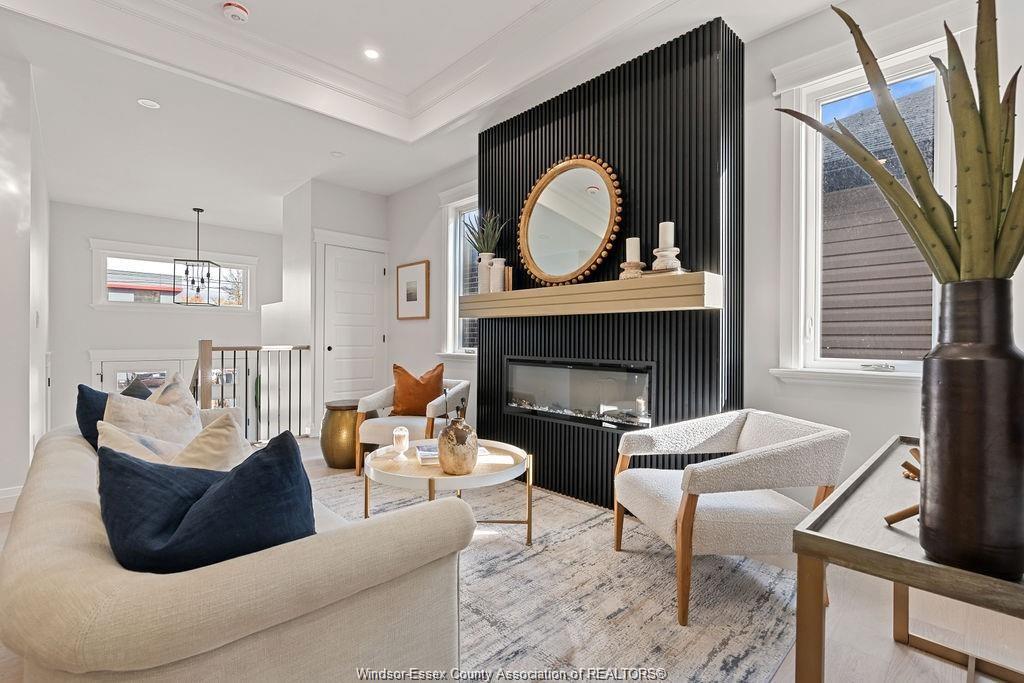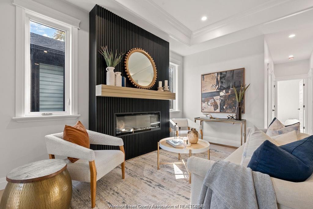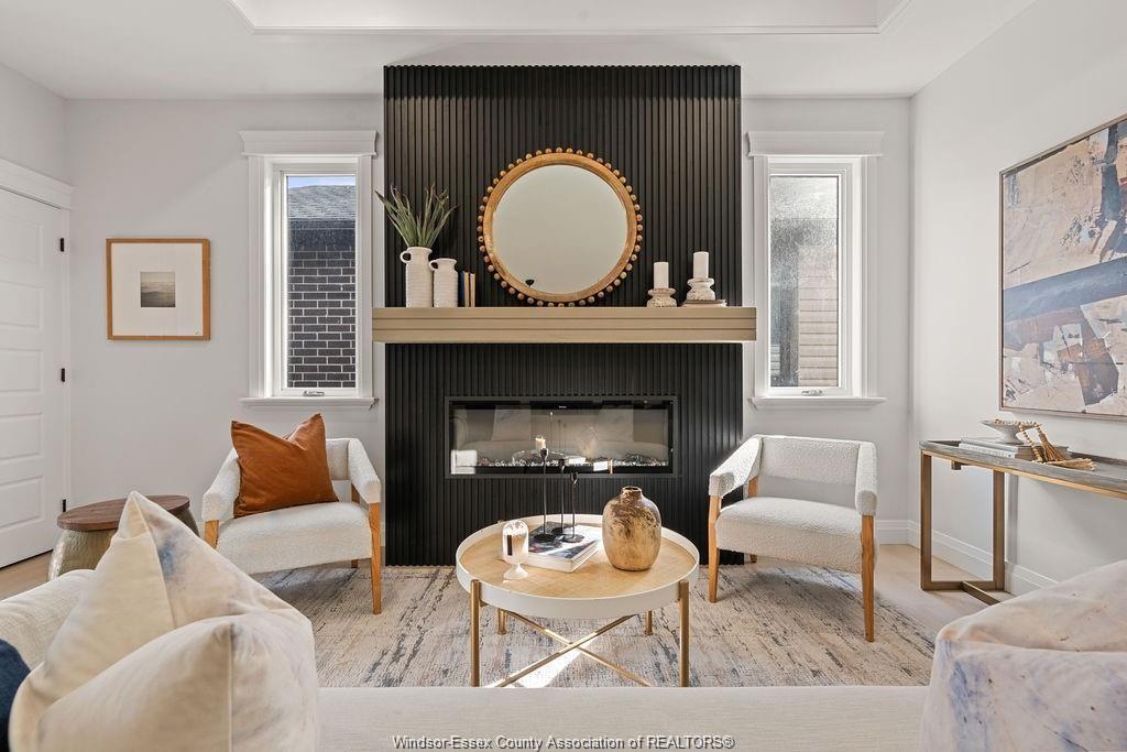 and range hood, custom window millwork, vaulted ceilings, custom fireplace feature wall, tiled shower and
