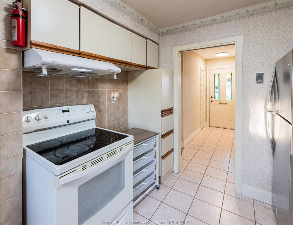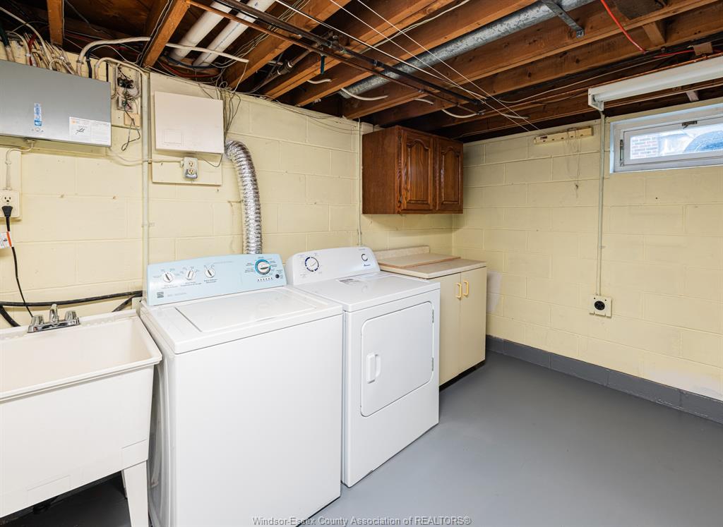 Appliances including washer, dryer, fridge, and stove.
