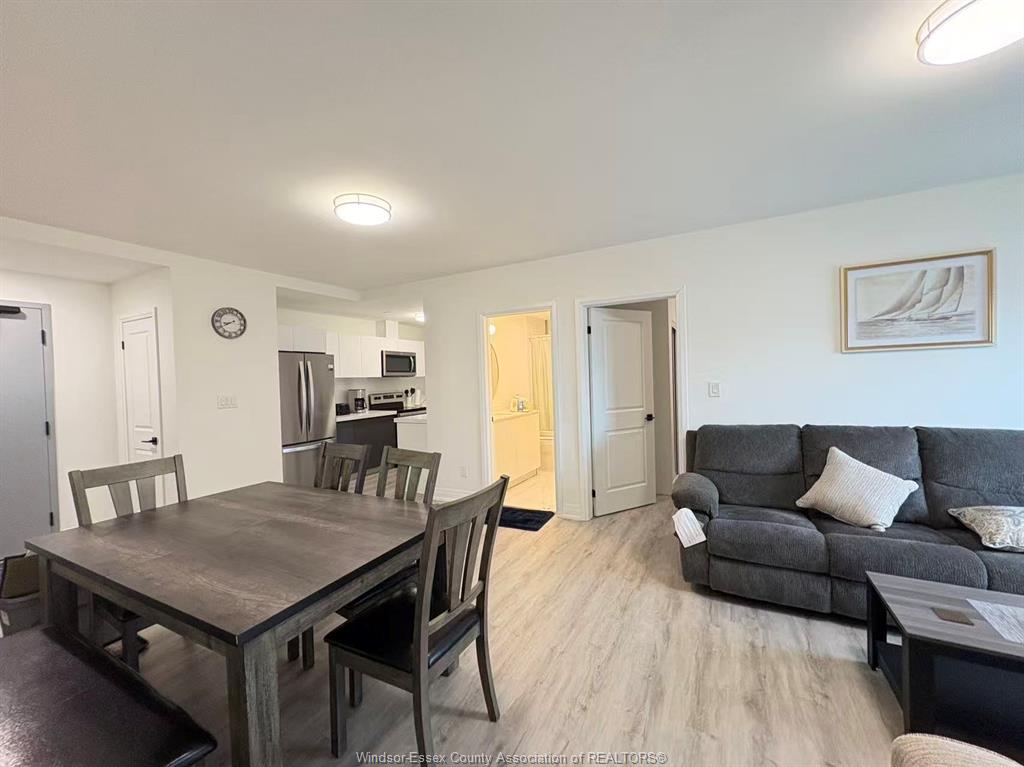 living with high-end stainless steel appliances, quartz countertops, open-concept layout with large windows,