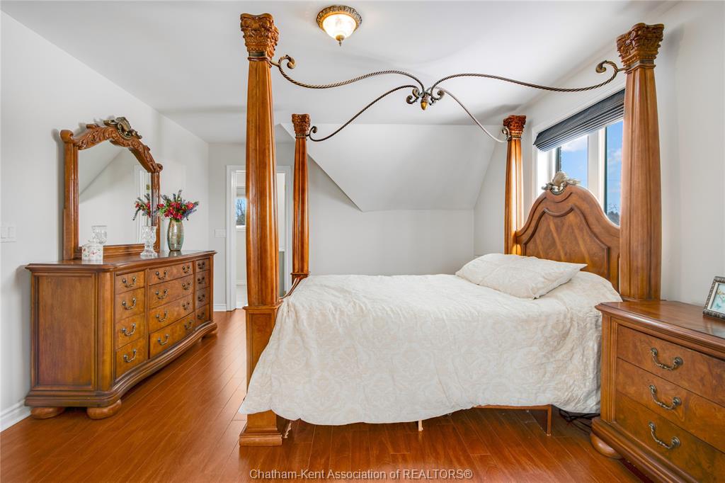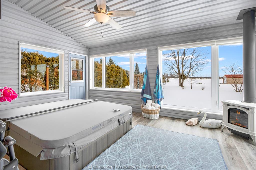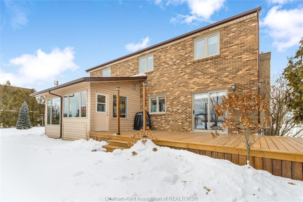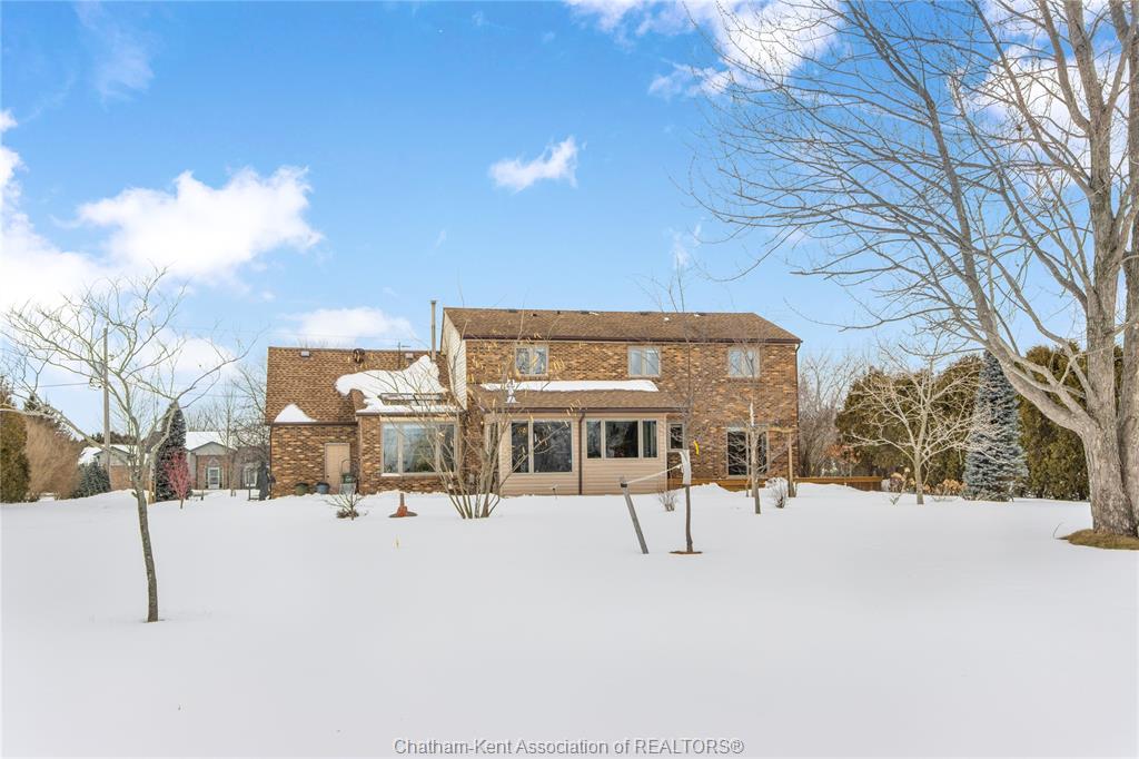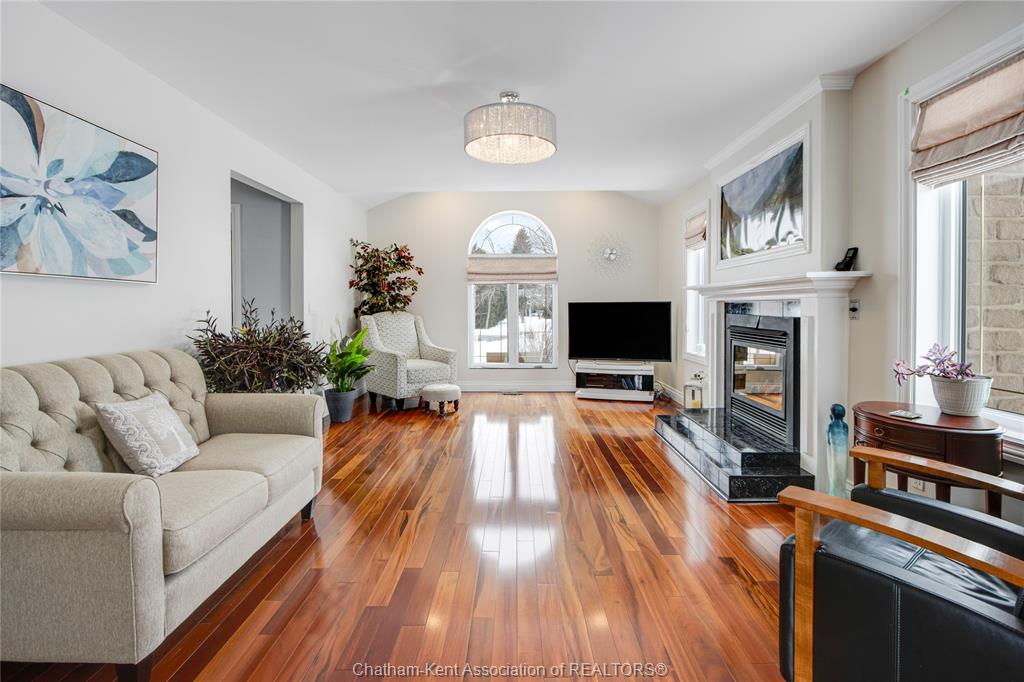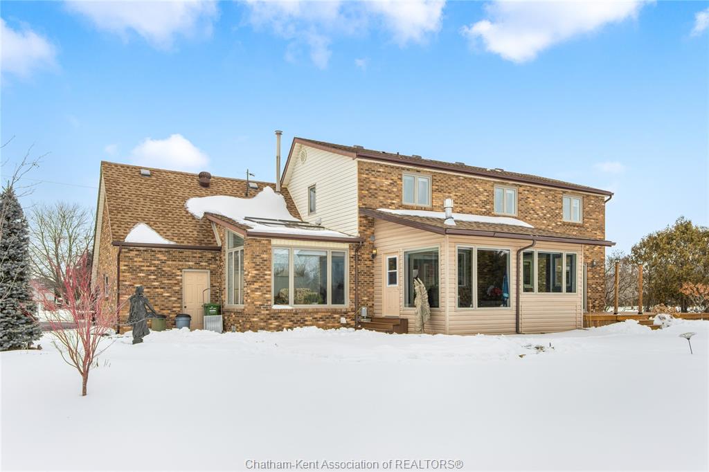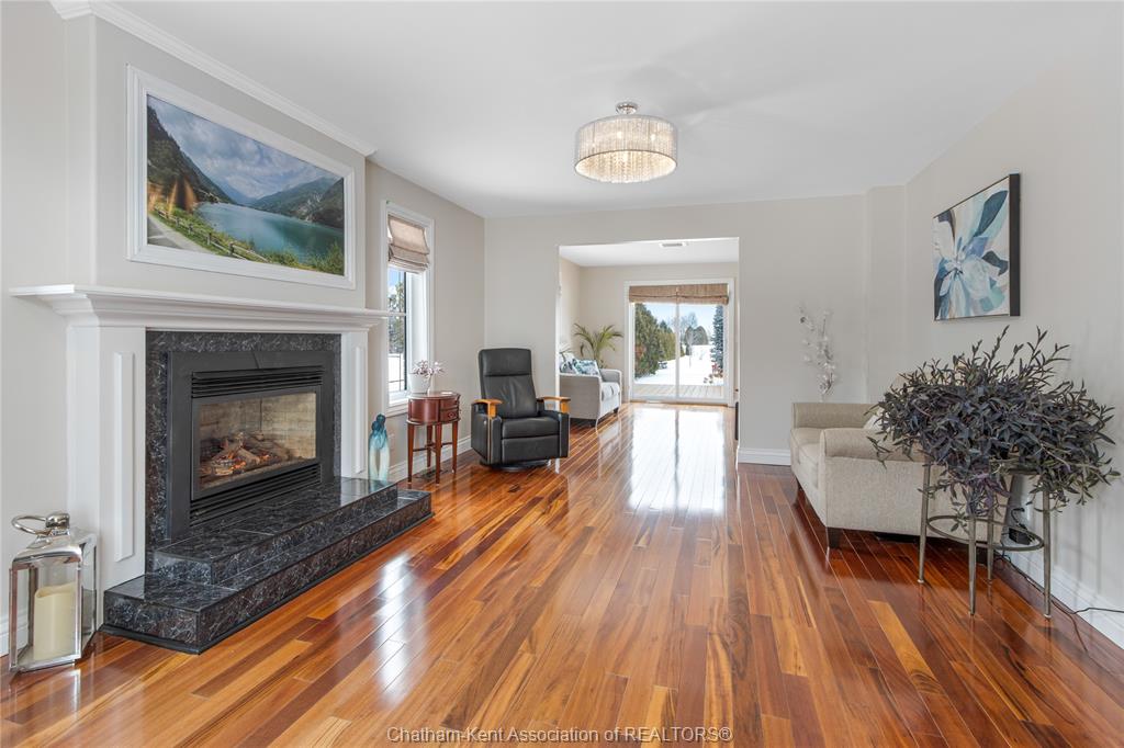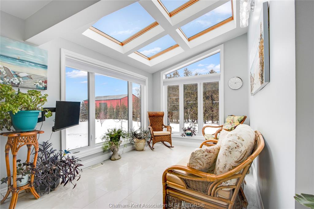 Situated on a large, private country lot with agricultural zoning at the rear, this unique two-storey home showcases true pride of ownership. Step inside and you’ll immediately notice the many upgrades, including Brazilian hardwood and porcelain tile throughout the main floor plus a sleek porcelain staircaise. A convenient office or main-floor bedroom is located just off the front entry. The heart of the home features a stylish kitchen with quartz countertops and a stunning waterfall edge that connects the dining area and sunroom featuring huge skylights. This bright, open space is filled with natural light, creating an incredible sun-soaked atmosphere throughout the day. The warmth continues into the 2nd sunroom where you’ll find ample windows, a hot tub and a cozy gas fireplace that is perfect for relaxing year-round. The living room also offers a gas fireplace and connects to a potential formal dining space, complete with a wet bar rough-in and patio doors leading to a large deck overlooking the deep treed backyard . Upstairs, you’ll find four bedrooms, including a primary suite with his-and-hers closets and a stylish ensuite featuring a walk-in marble-tiled shower. An adjacent bedroom offers direct access to the primary, making it ideal for a nursery, office, or impressive walk-in closet. Designed with convenience in mind, this home also includes a large walk in attic space for extra storage, a 21’ x 17’ shed, and a spacious horseshoe driveway leading to a double attached garage. Located just 10 minutes from Belle River, 25 minutes to Kingsville, and 30 minutes to downtown Windsor. Don’t miss this incredible opportunity—call today!